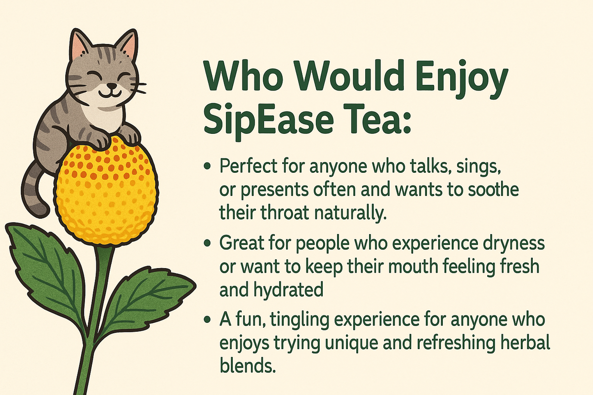While Spilanthes is widely used in teas and natural health products, SipEase Tea is not intended to diagnose, treat, cure, or prevent any disease. Everyone’s body is different, and herbal products can interact with medications or existing health conditions.
